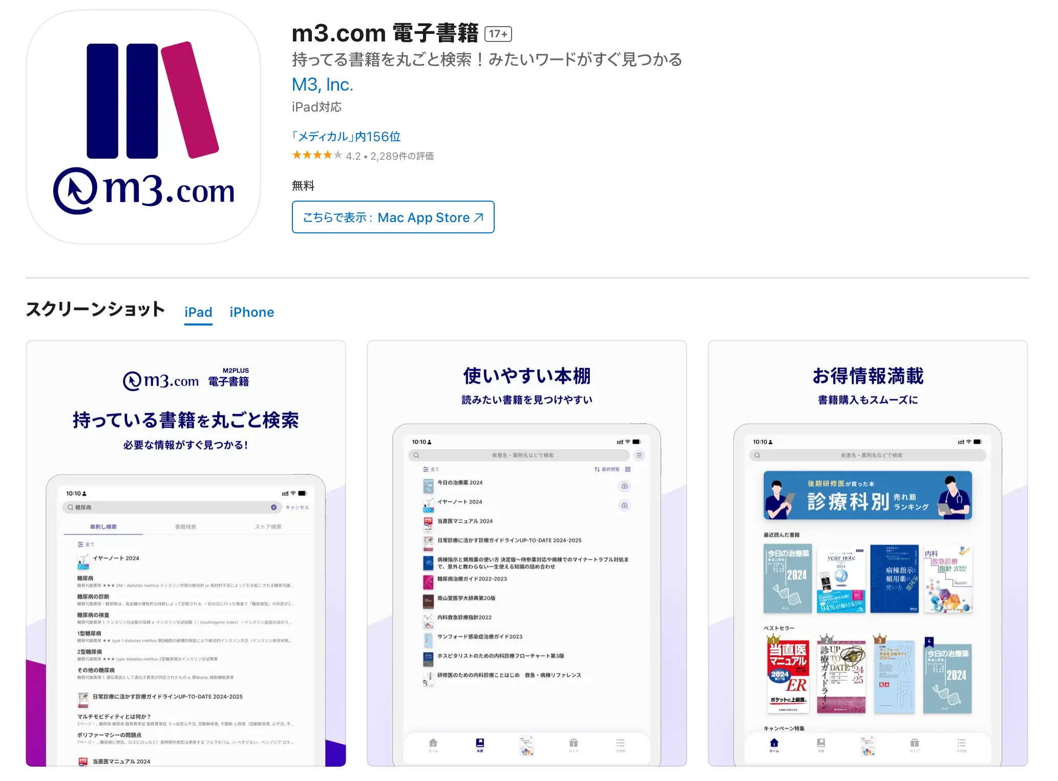 【医書.jp】と【m3.com電子書籍】は知名度と評価が高く、この2つのアプリを登録すれば有名な専門書はカバー可能です。