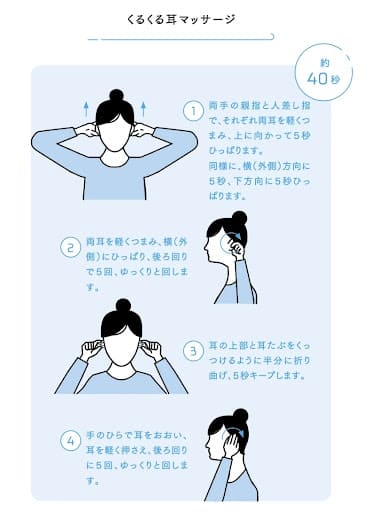 内耳の血流を良くして水分が滞るのを防ぐ「くるくる耳マッサージ」があります。すきま時間で気軽にできるので、おすすめの対策法ですよ。[4]