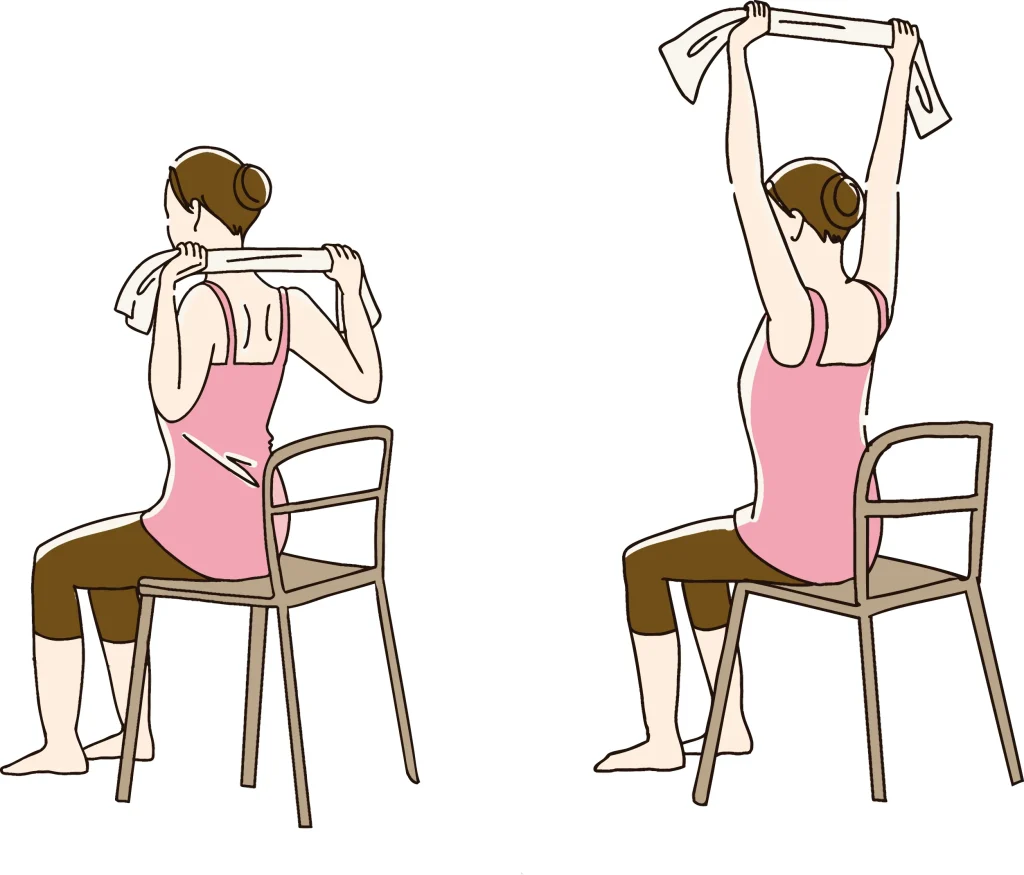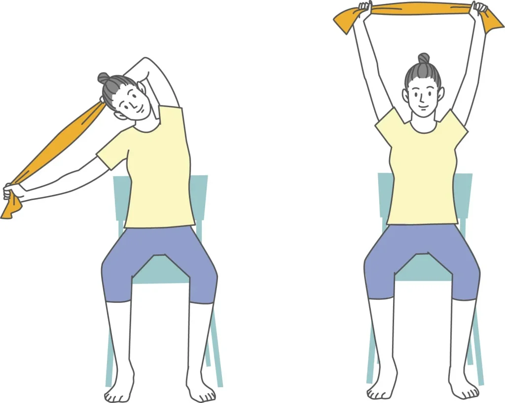 - タオルの両端を持ち、両腕を天井の方向へ伸ばす。